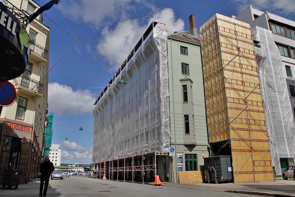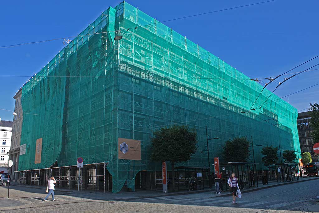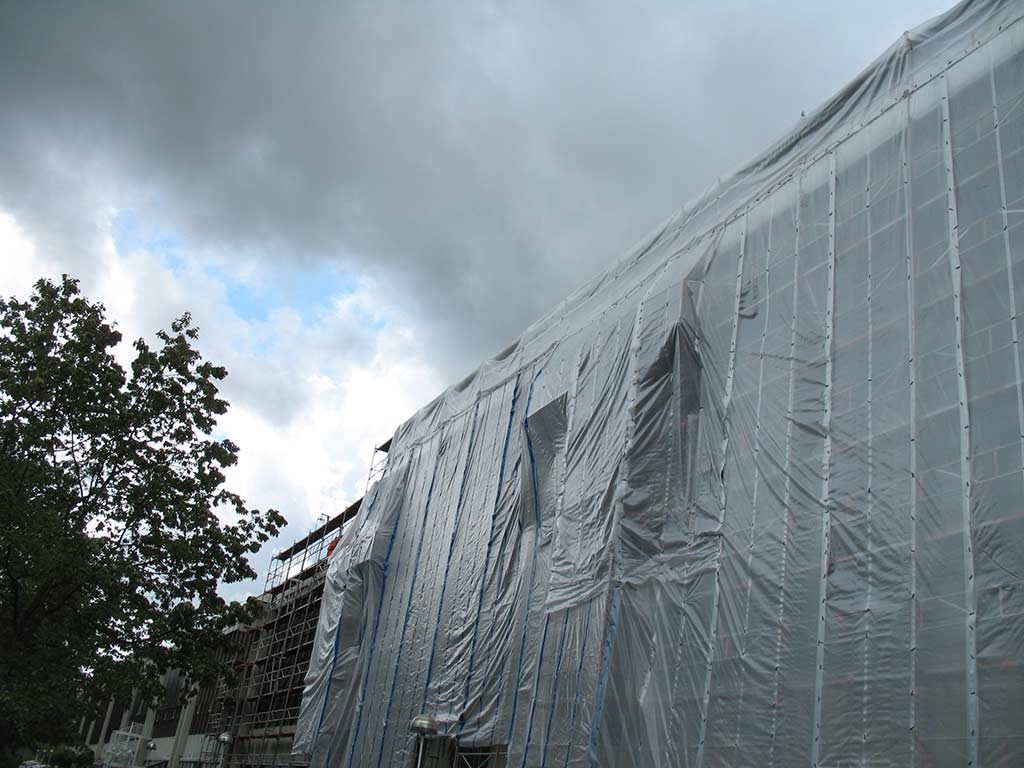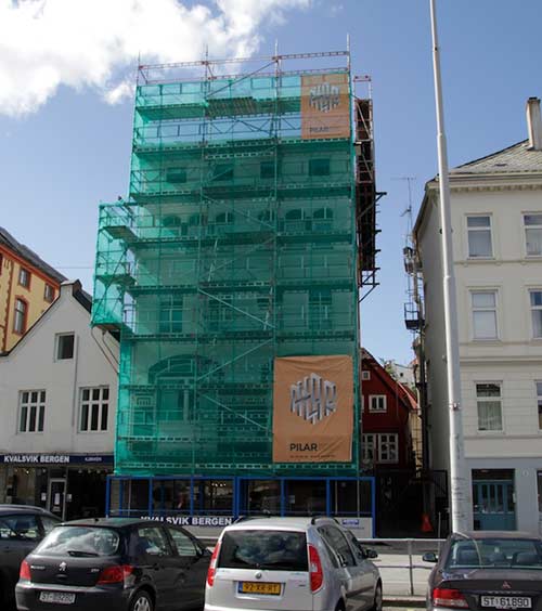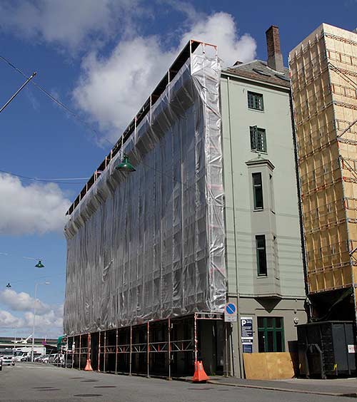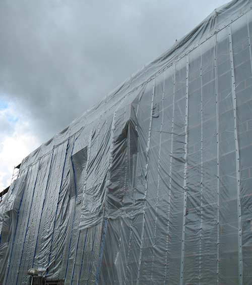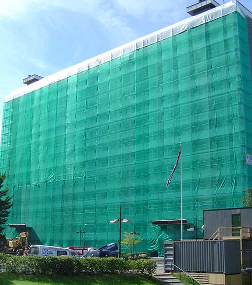 Alle våre stillaser kan dekkes til med not eller presenning. Not og presenning kan også leveres i flammehemmende materiale.