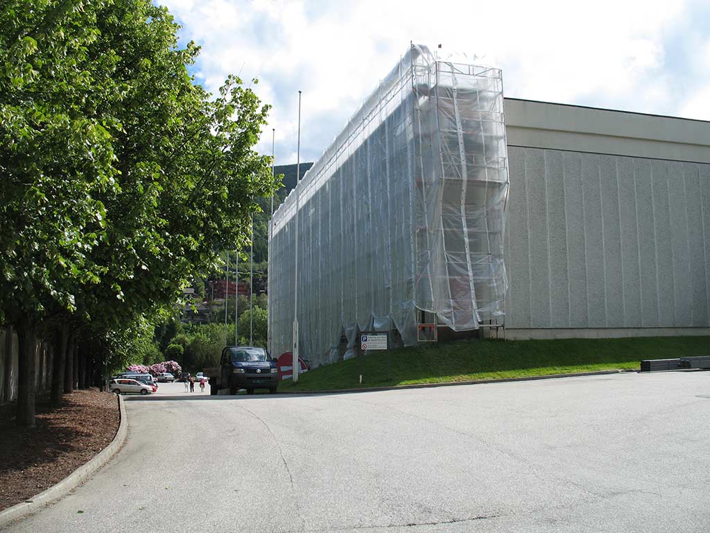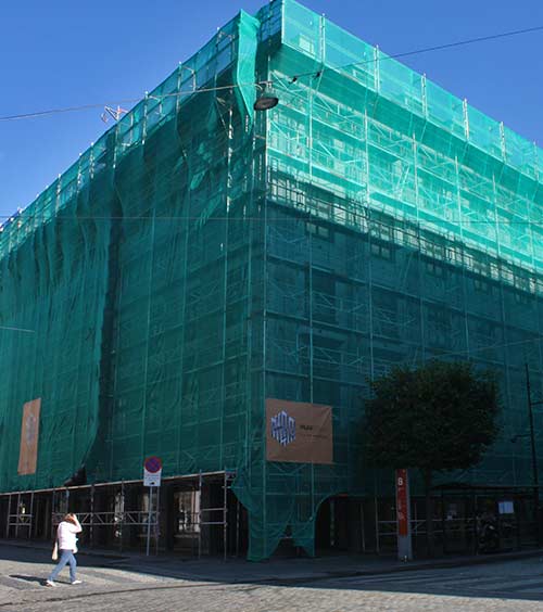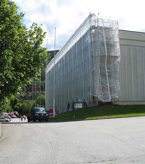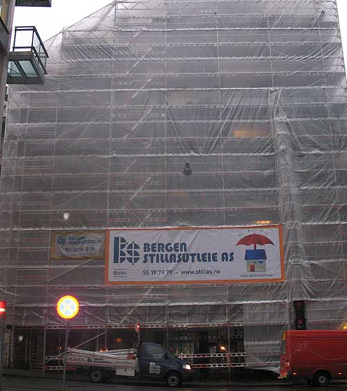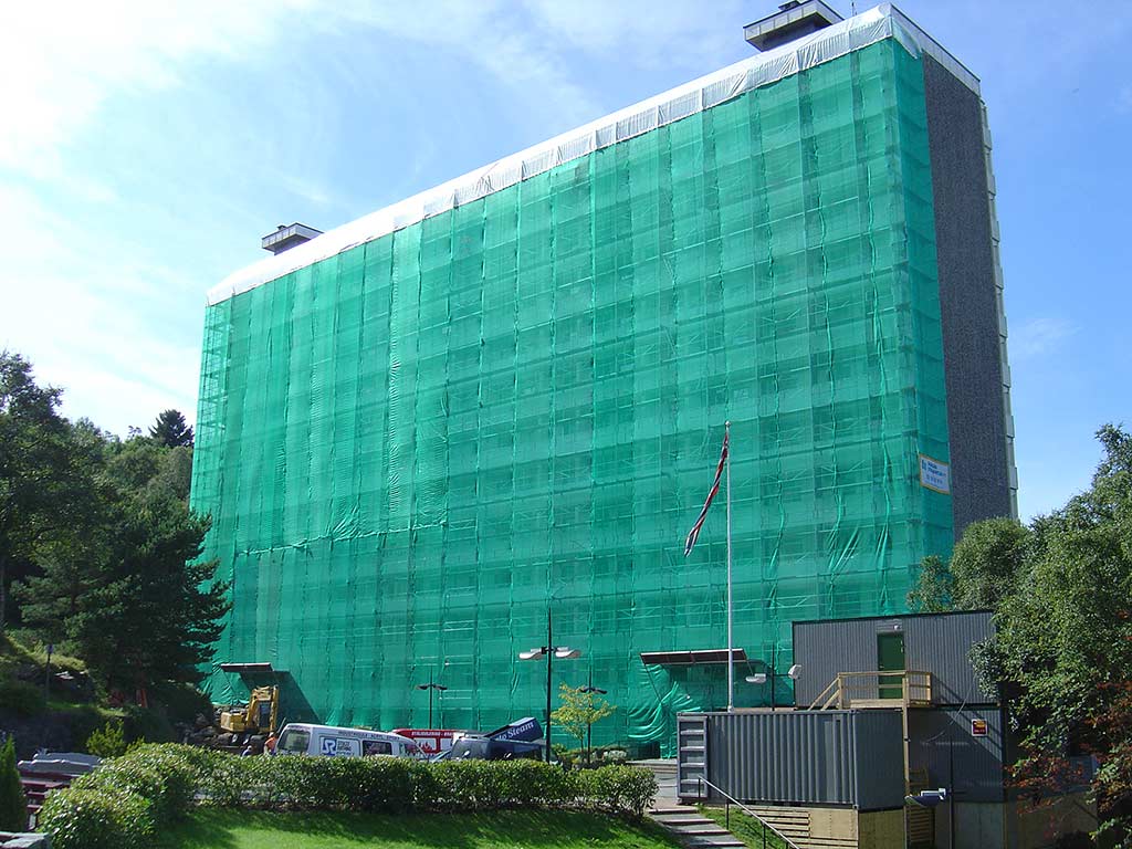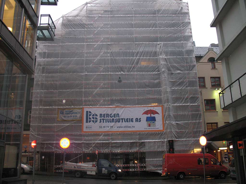 Alle våre stillaser kan dekkes til med not eller presenning. Not og presenning kan også leveres i flammehemmende materiale.
